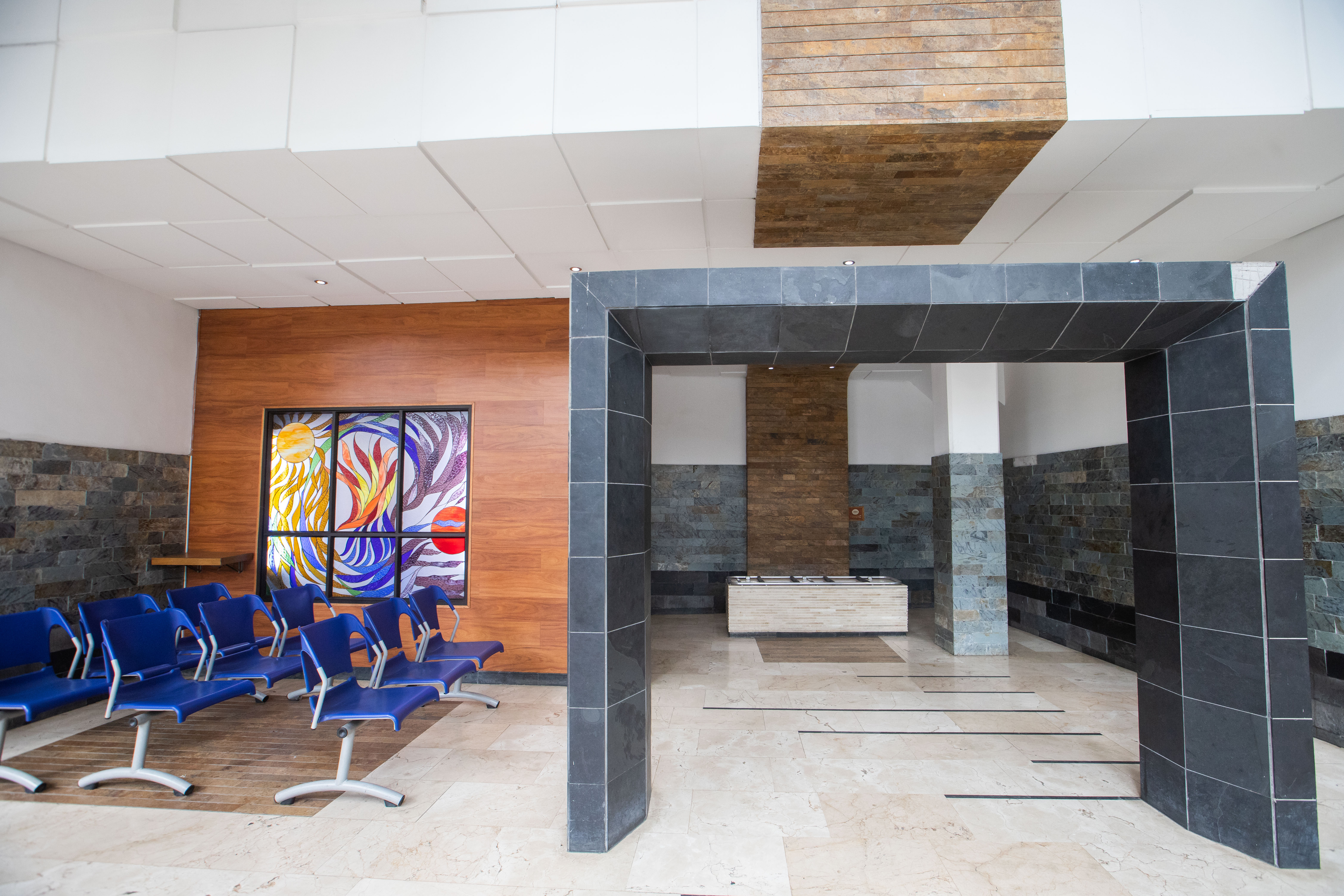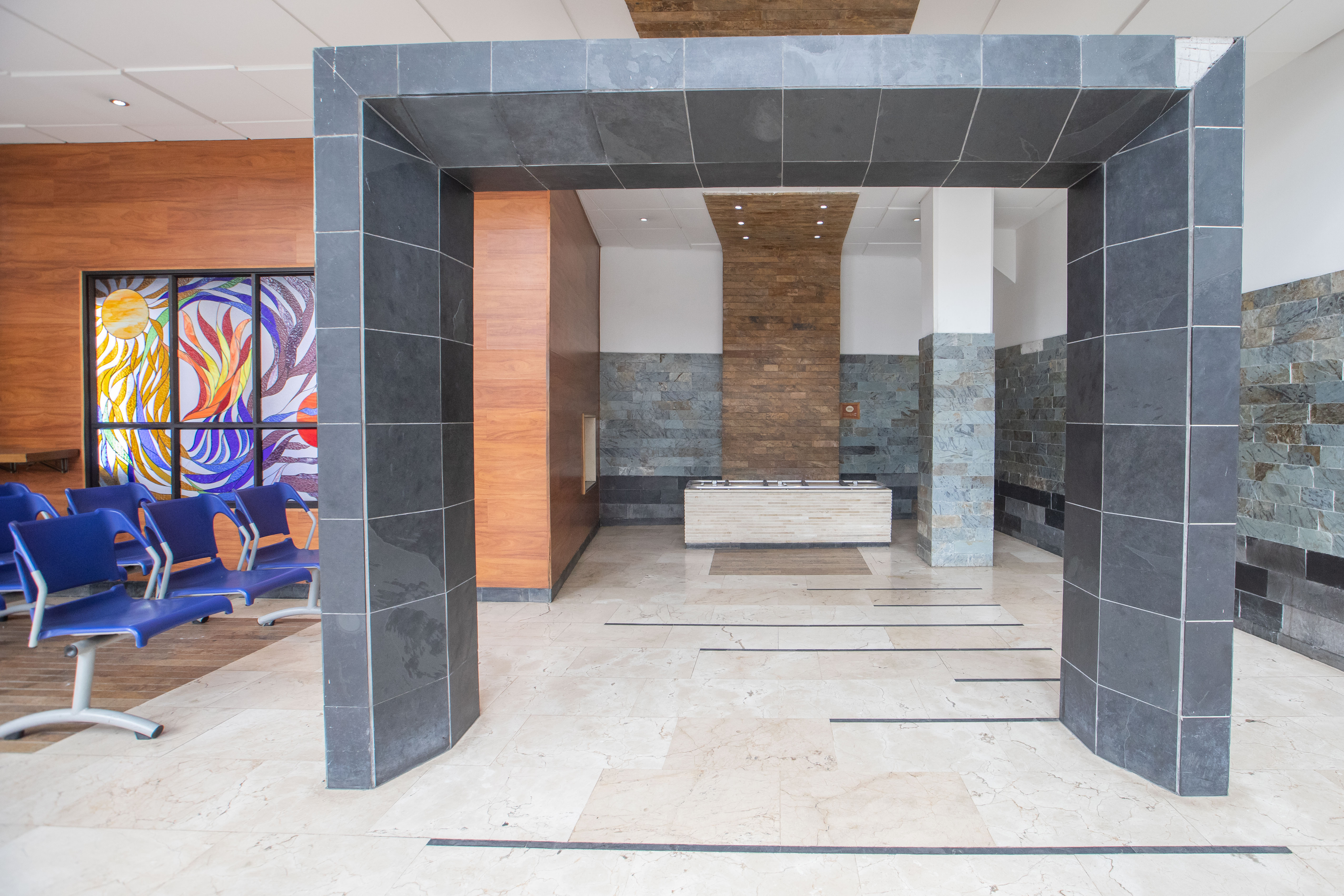 Allí también se encuentra un vitral apacible lleno de significado. En el principio, una gran esfera amarilla, el Sol, que alimenta un centro de color, símbolo de la vida. Al final, un ocaso, un sol atardecido que se va ocultado en el horizonte como representación del final de la existencia.