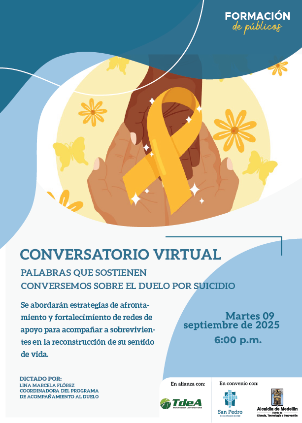 Te invitamos a participar en este conversatorio académico enfocado en comprender el proceso de duelo por suicidio, identificar estrategias de afrontamiento y promover acciones que fortalezcan las redes de apoyo, orientadas a potencializar la reconstrucción del sentido de vida en las personas sobrevivientes.
